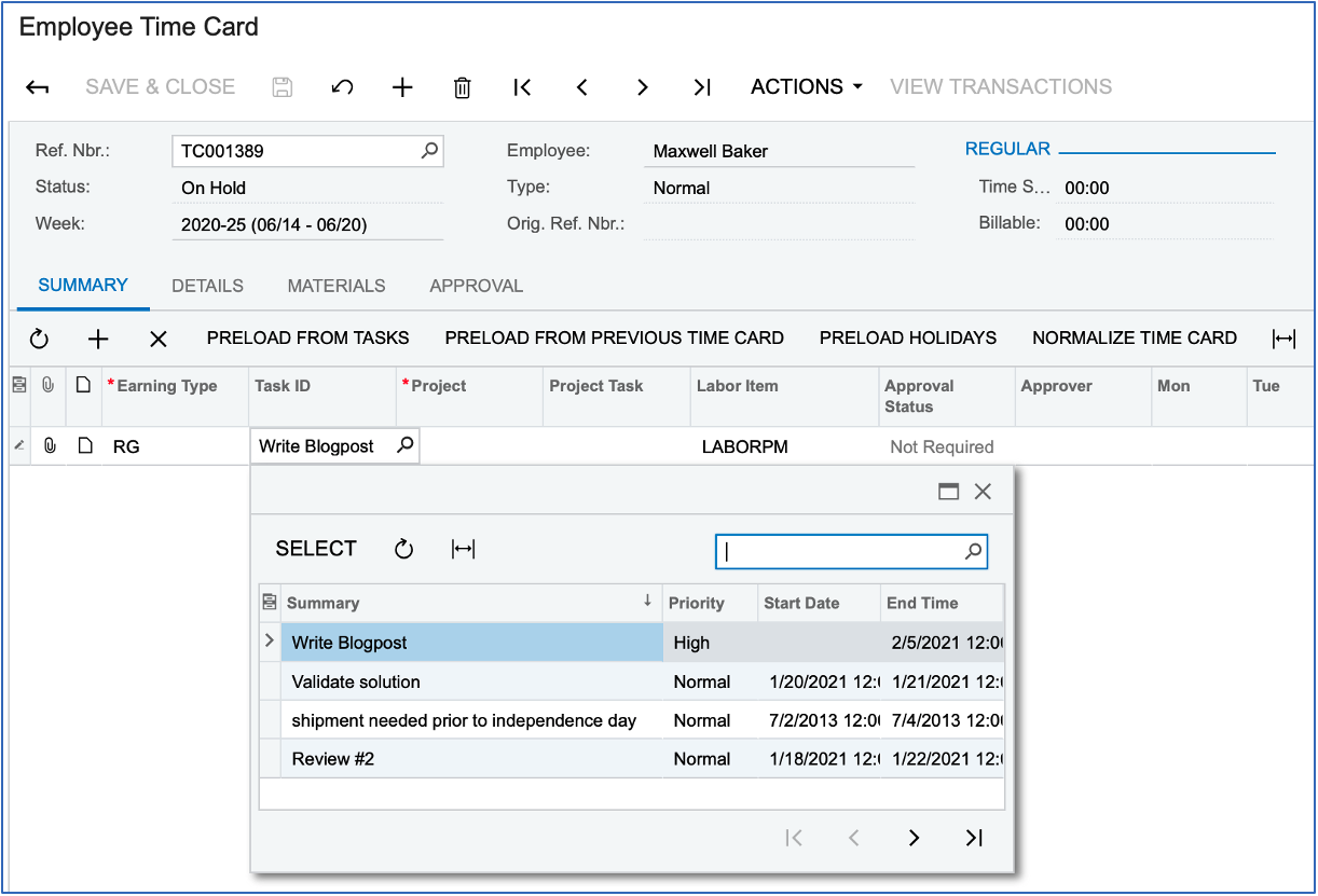 After a task is created and assigned to an owner (for example, I added a task to write this blogpost), it becomes visible to both the creator and owner in Tasks (see Figure 2), Dashboard, and Time Cards (see Figure 3).